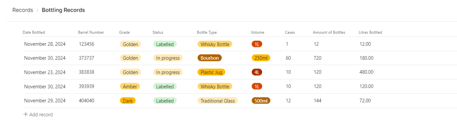 • Bottled Records : keep track of bottled stock